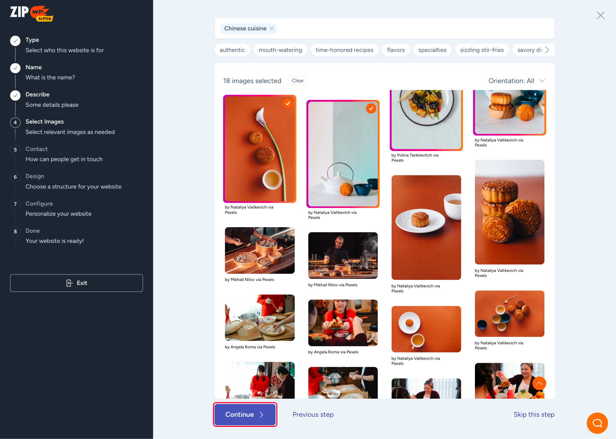 - Zip will fetch relevant images from different sources that should be on your website based on the prompt you have given. You can select the images that you would like to display on your website. Once you’re satisfied, click on the Continue button.