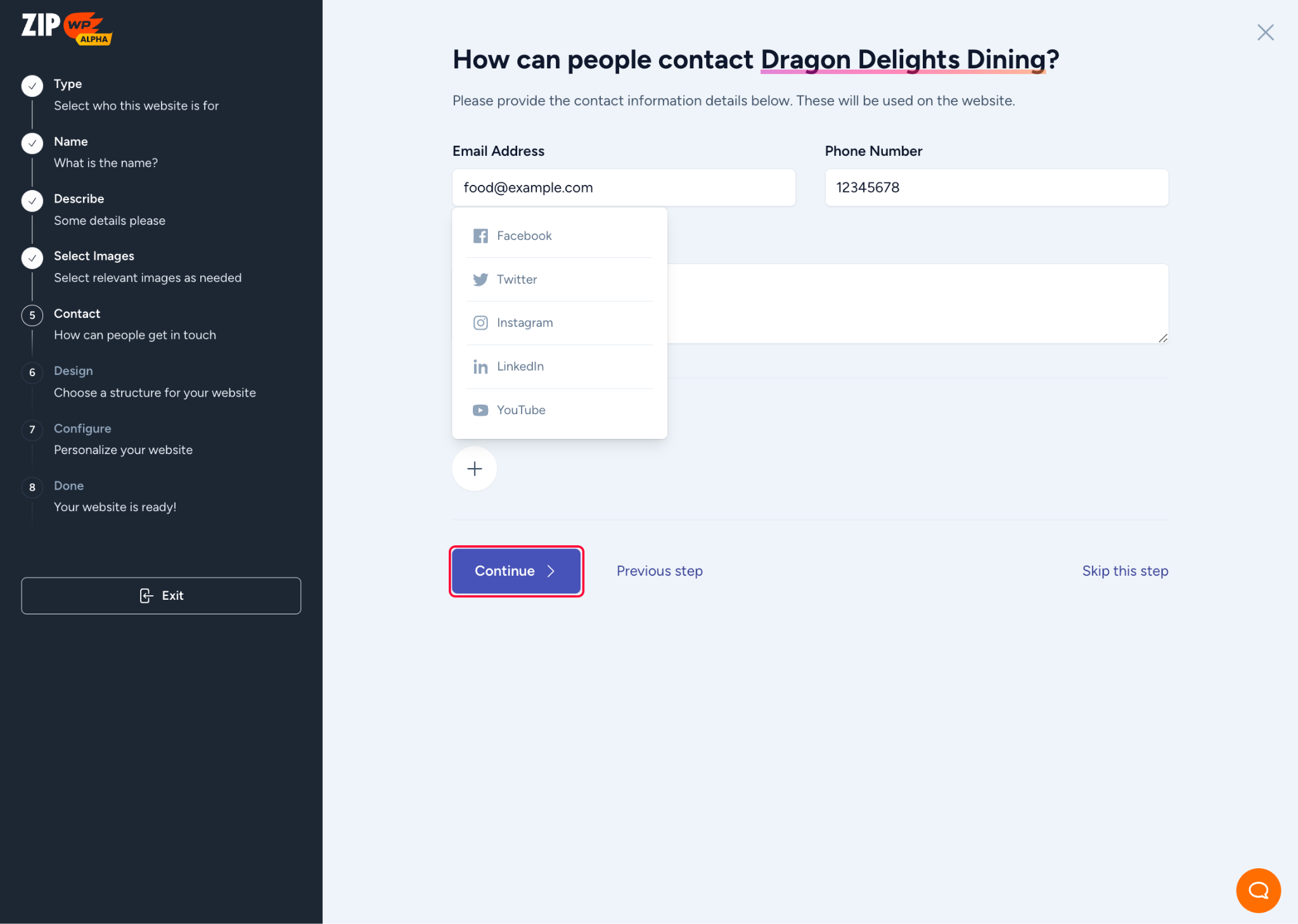 - In the next step, please provide the contact information related to your business. This information will be displayed at appropriate places on your website, such as the footer or contact page. You can also add your social media accounts.